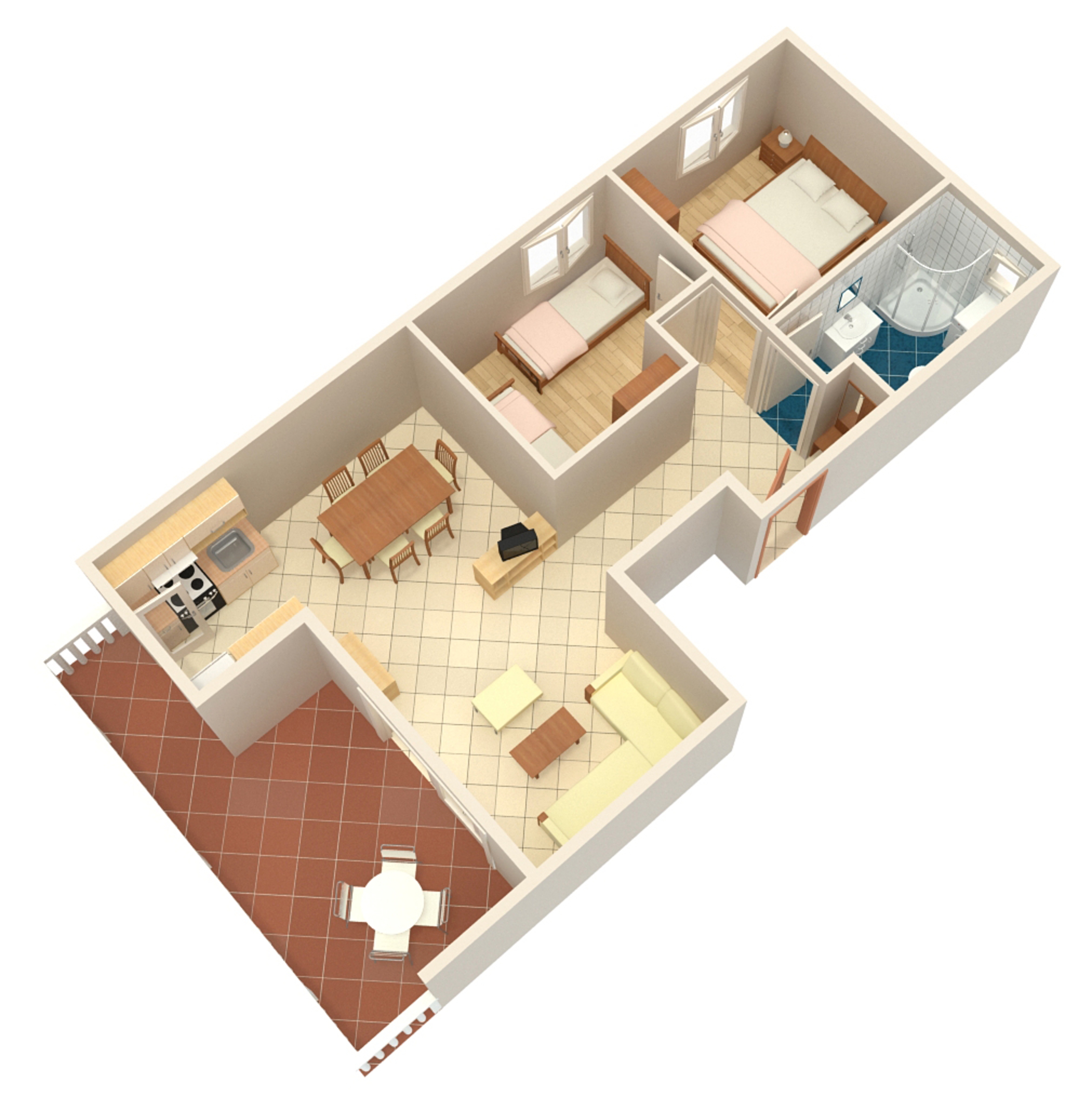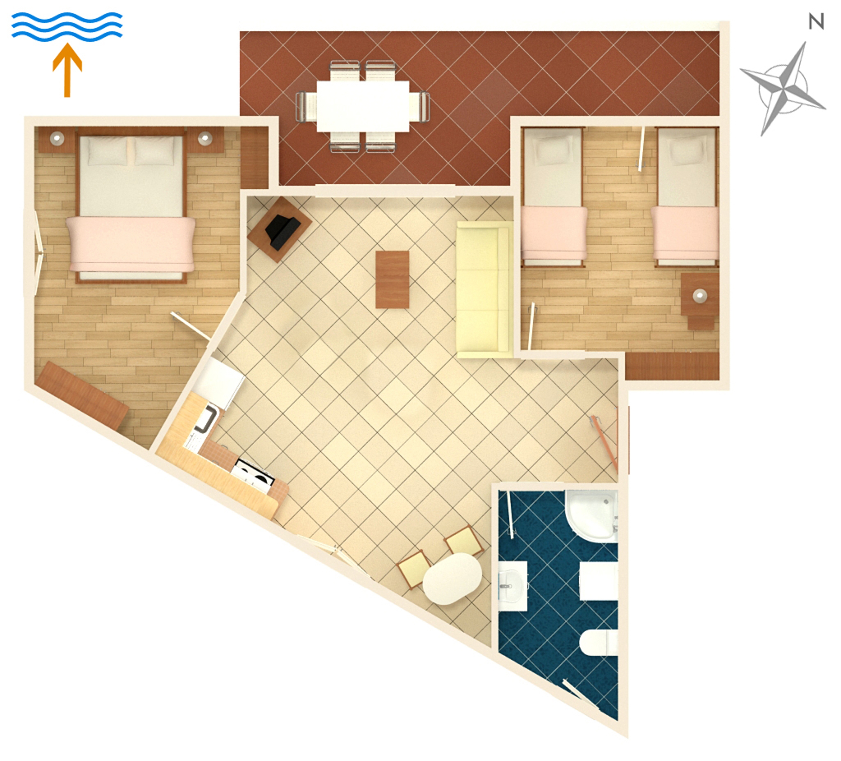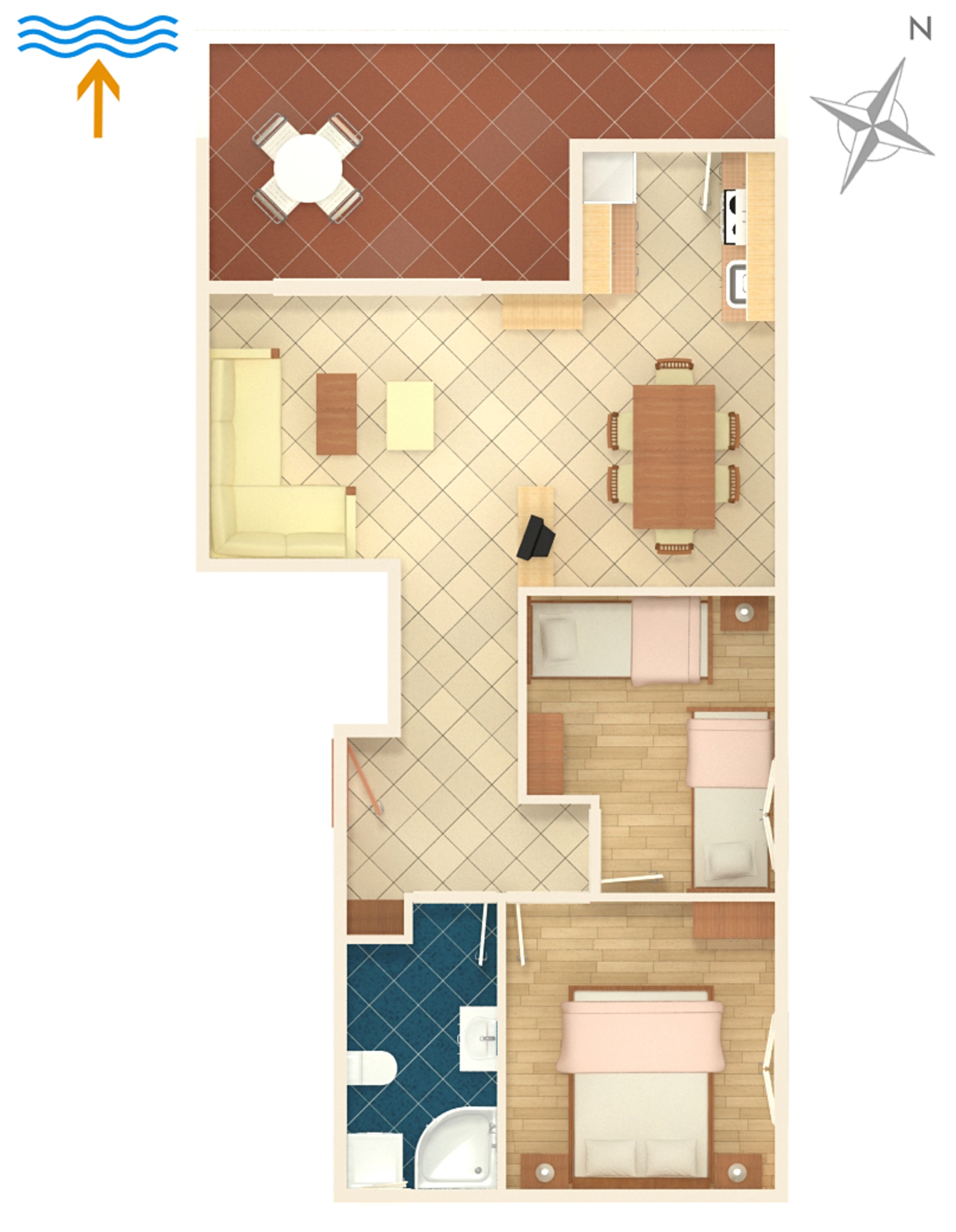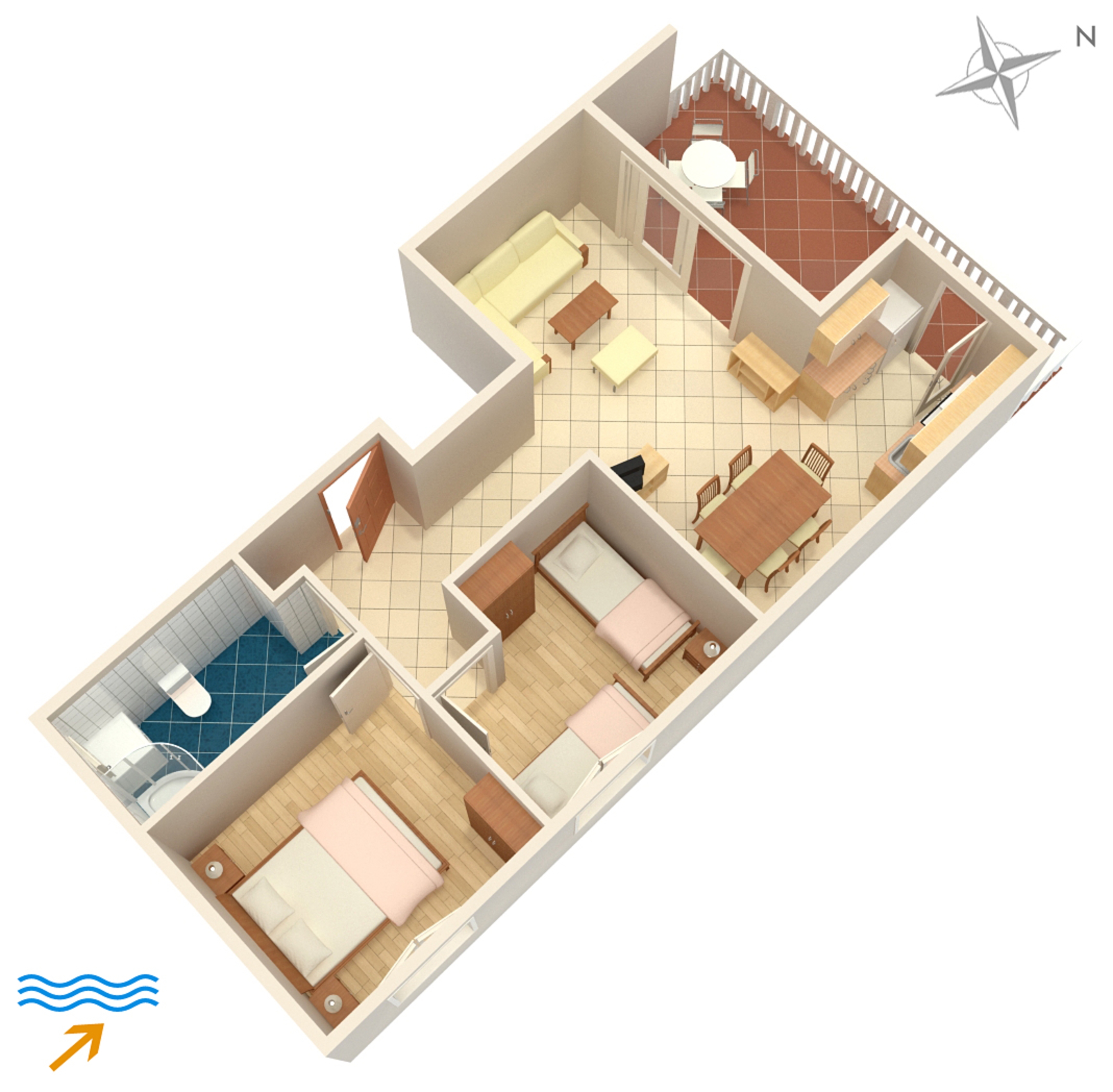 Apartment can accommodate 4 guests. Beds are situated in 2 sleeping rooms, within 47m2. Guests can use a private terrace to enjoy the warm summer evenings. The apartment offers the sea view. Food can be prepared using barbecue which is shared with other guests too.