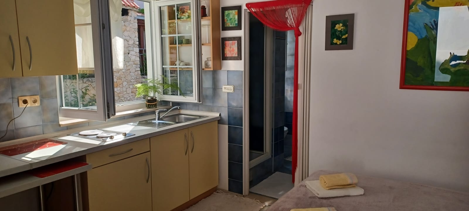 Studio flat can accommodate 2 guests. Beds are situated in 1 sleeping rooms, within 22m2. Guests can use a private balcony to enjoy the warm summer evenings. The studio offers the sea view. Food can be prepared using barbecue which is shared with other guests too.